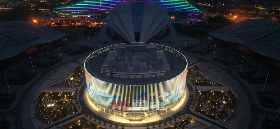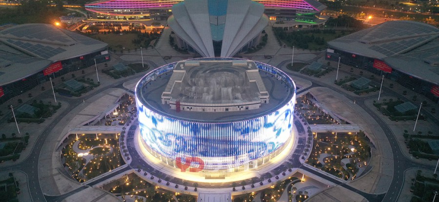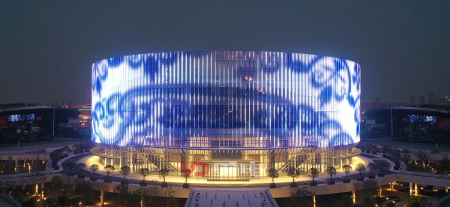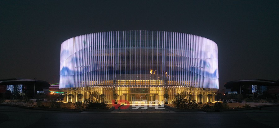武漢國博會展中心提升工程-漢廳 國際一流的會議中心,為武漢城市會客廳,采用勇電LED燈光,聚焦博覽城中心,突顯地標建筑夜景。
